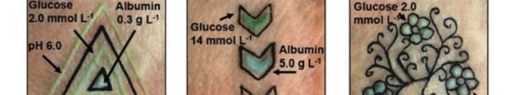 Одним из первых этот подход начали разрабатывать исследователи Массачусетского технологического института, а также их коллеги из Гарвардской медицинской школы в рамках проекта DermalAbyss1. Исследователи отметили, что в настоящее время диабетикам необходимо постоянно контролировать уровень глюкозы, прокалывая для этого кожу от 3 до 10 раз в день. С помощью Dermal Abyss болезненная процедура заменяется татуировкой, цвет которой меняется от розового до фиолетового в зависимости от уровня глюкозы. Таким образом, пользователь может отслеживать изменения цвета и потребность в инсулине. При этом исследователи не ограничились оценкой только уровня глюкозы в крови. Они создали три различных типа биосенсорных чернил, которые измеряют изменения в интерстициальной жидкости кожи, меняя цвет в зависимости от уровня глюкозы, натрия или рН2. Предварительная оценка проводилась на модели кожи свиньи ex vivo1.